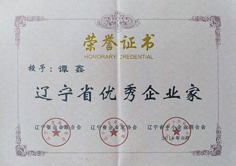 譚鑫總經理2018年度遼寧省優(yōu)秀企業(yè)家榮譽證書