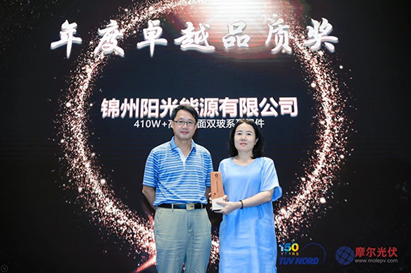2019年8月22日,由TüVNORD和摩爾光伏主辦的第二屆雙面雙玻與平價(jià)上網(wǎng)技術(shù)路線研討會(huì)在蘇州召開(kāi),同時(shí)舉行了“2019光伏技術(shù)風(fēng)向獎(jiǎng)”頒獎(jiǎng)典禮。 “光伏技術(shù)風(fēng)向獎(jiǎng)”旨在鼓勵(lì)光伏企業(yè)在推動(dòng)光伏行業(yè)技術(shù)進(jìn)步,促進(jìn)光伏行業(yè)技術(shù)水平的提高與創(chuàng)新。眾多企業(yè)高管、行業(yè)專家、媒體代表約200余人參與了此次盛會(huì),見(jiàn)證了這一光榮時(shí)刻。錦州陽(yáng)光能源的410W+高效雙面雙玻組件憑借優(yōu)秀的產(chǎn)品性能榮獲“