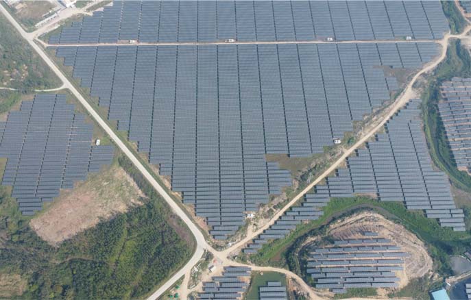 值得一提的是,廣東省開(kāi)平市150MW光伏項(xiàng)目綜合采用了“農(nóng)光互補(bǔ)+漁光互補(bǔ)”新型發(fā)電模式——板上光伏發(fā)電,板下土地進(jìn)行農(nóng)業(yè)種植、板下水域進(jìn)行漁業(yè)養(yǎng)殖——滿足周邊用電需求的同時(shí),還實(shí)現(xiàn)了電力與農(nóng)業(yè)、漁業(yè)的有機(jī)結(jié)合,實(shí)現(xiàn)三重經(jīng)濟(jì)收益。從高空俯瞰,耕地、漁田與陽(yáng)光組件交相輝映,波瀾壯闊。