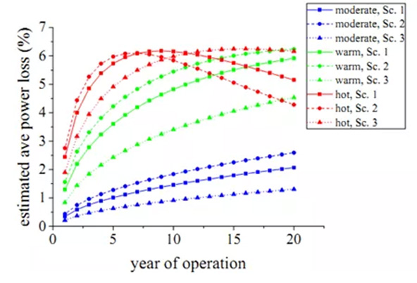 結(jié)果如圖所示,在炎熱地帶,年發(fā)電損失約達(dá)到5%,當(dāng)達(dá)到最大衰減以后,第7年以后組件在熱輔助的作用下開(kāi)始功率恢復(fù),但是恢復(fù)的程度有限,需要花費(fèi)的時(shí)間也很長(zhǎng),如圖則需要10年以上。在溫暖地區(qū),第5年功率衰減達(dá)到4%左右。在中性氣候地區(qū),影響較小。